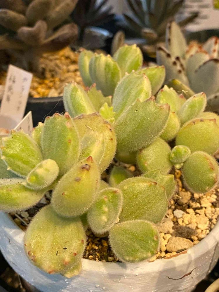この子3年くらい育ててるけど、なんか白い部分増えてきた😂熊童子でお迎えしたけど、最近は熊童子錦かってくらい斑入り💕