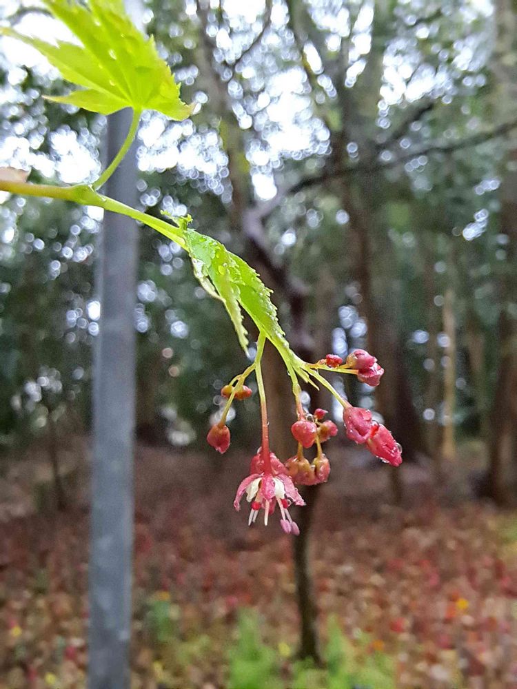 モミジの若葉を見ていると、小さな花がたくさん咲いていました。