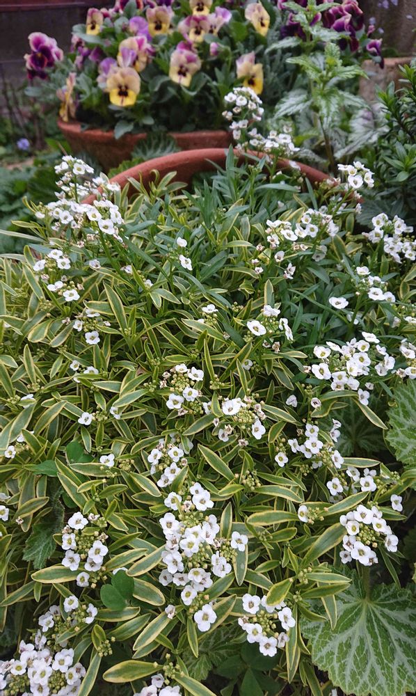 斜めに埋め込んだ鉢に植えたスーパーアリッサム・フロスティナイト🌿
