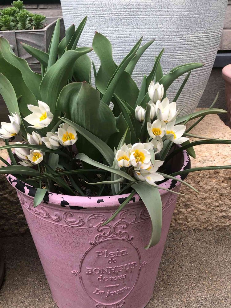 ミニチューリップです。後方にも別の種類のチューリップを植えたのですがまだ花芽上がってません。待ってるよ~♡♡