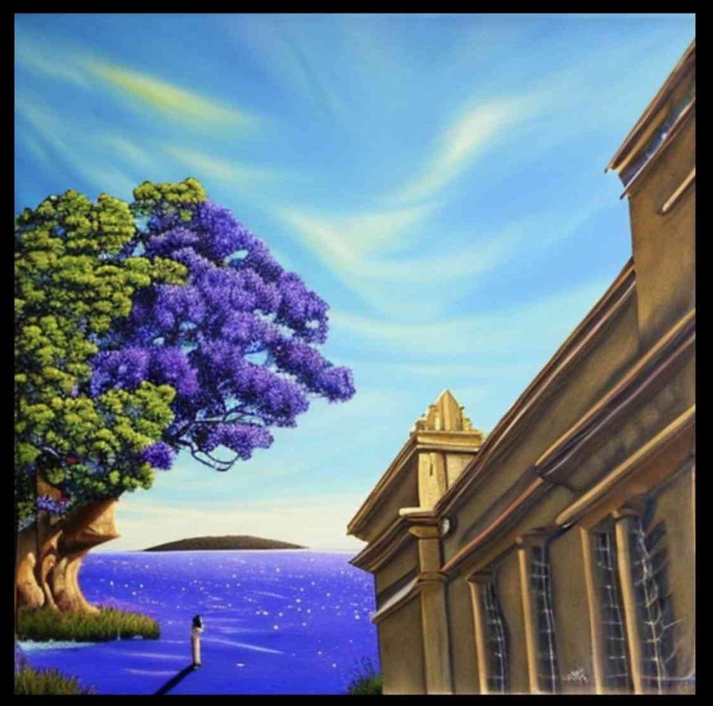 大空,青空,神秘的,城,幻想的,ファンタジー,超詳細,最高品質,傑作,シドニー,ジャカランダ, マクドゥーガル・ストリート
