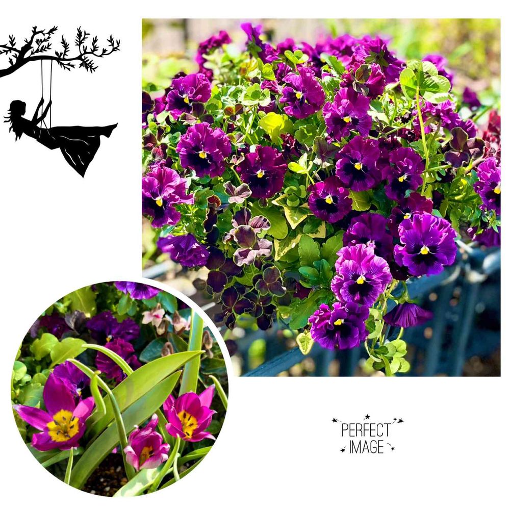 36cmのボールプランターに植えつけたフリルビオラ。1Pですがとても沢山の花をつけてくれ寒い冬にも鮮やかな花色に元気をもらいました✨鉢の裏側には原種チューリップの『ペルシャンパール』背が低めで可愛いです💕