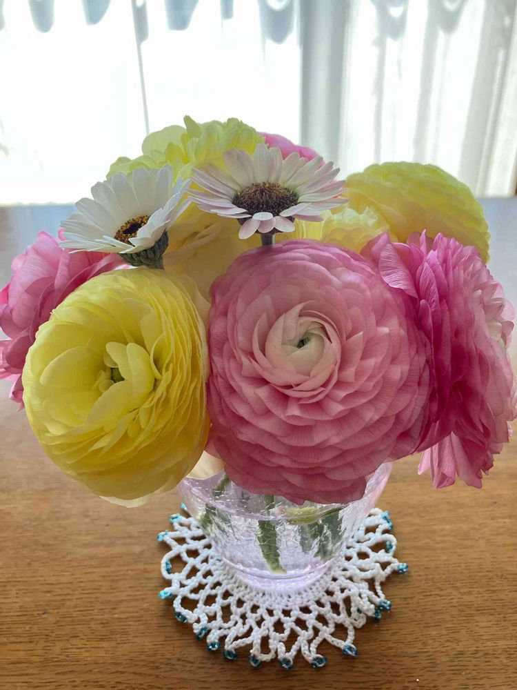 2色育てていたラナンキュラスが、次々と花を咲かせ、満開になったので、1番花を切って、グラスに入れて飾りました🌸🌼