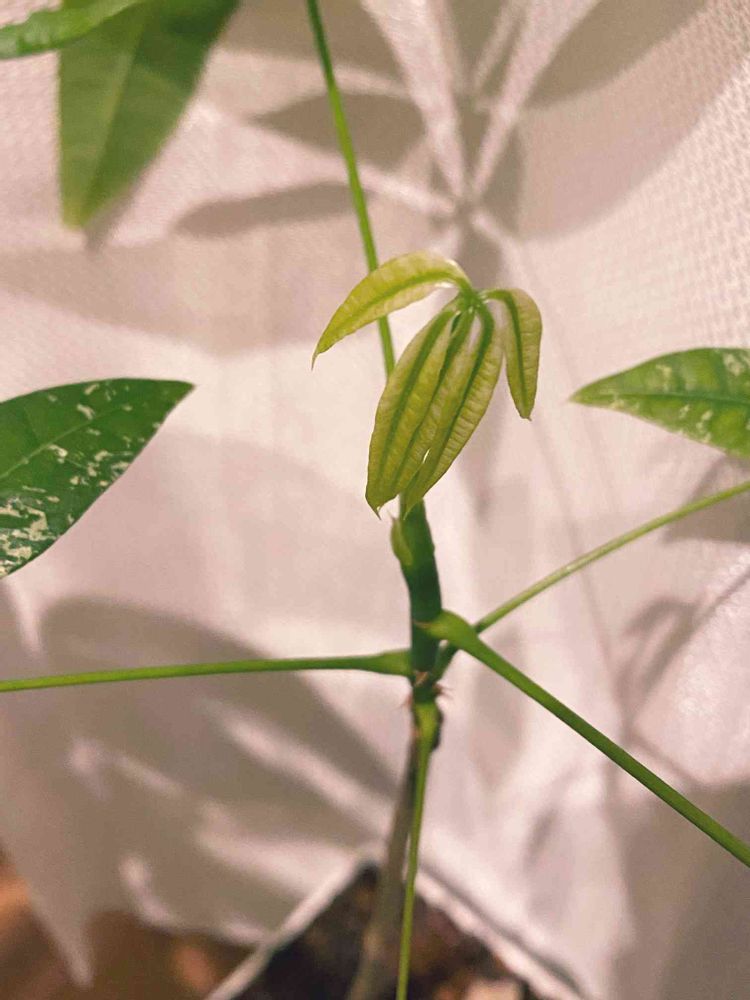 実生パキラミルキーウェイの斑が強い方から可愛い新芽が出て来ました。