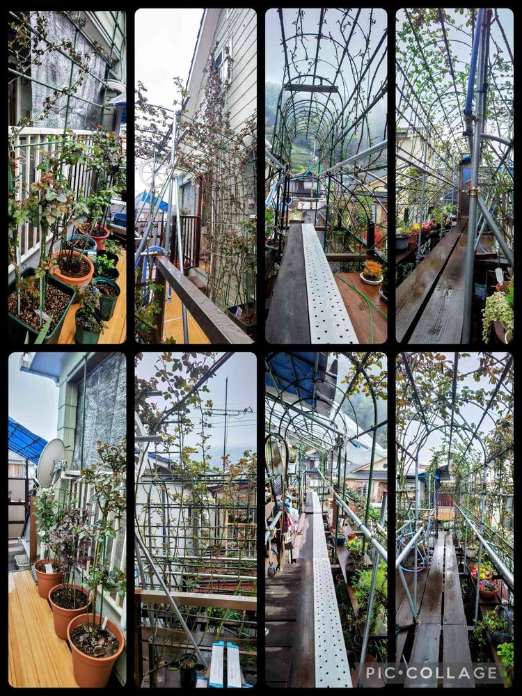 投稿写真は、今朝の二階の回廊と二段式アーチの様子です。つるバラも立ち木性バラも、新葉を吹き出しています。