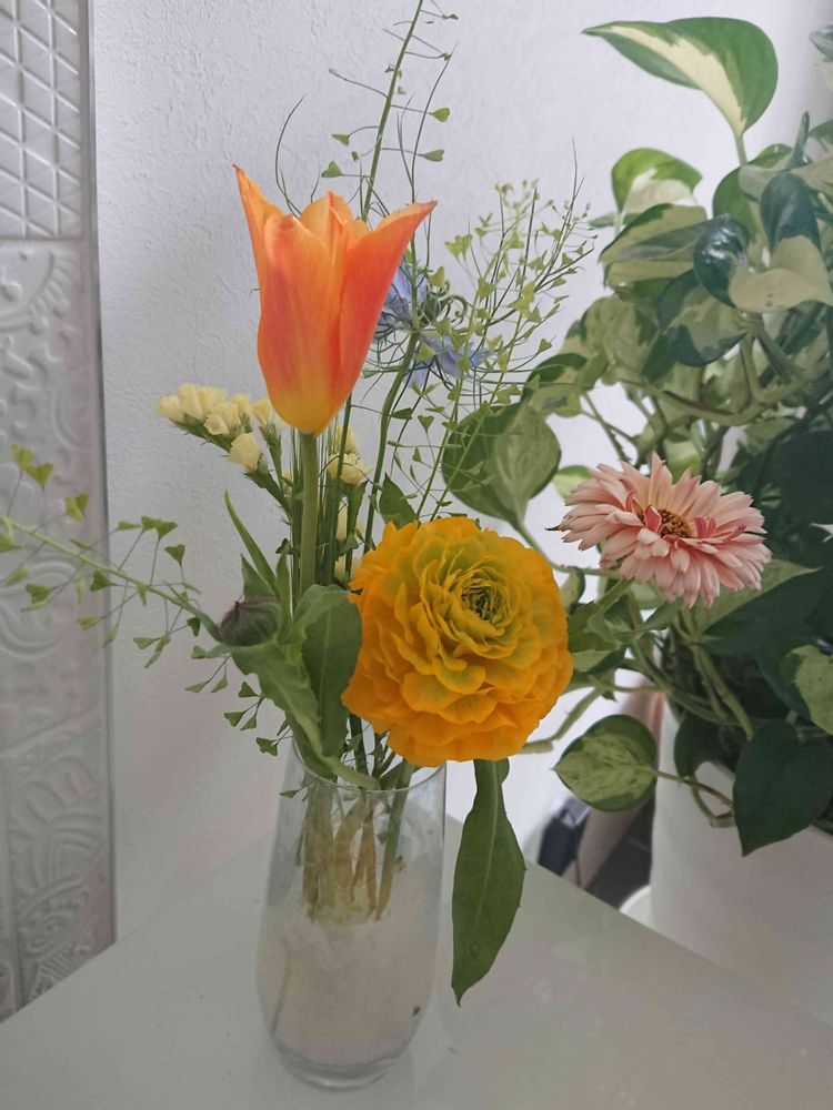 先日、駅構内にある花屋さんで残っていた小さな春の花束