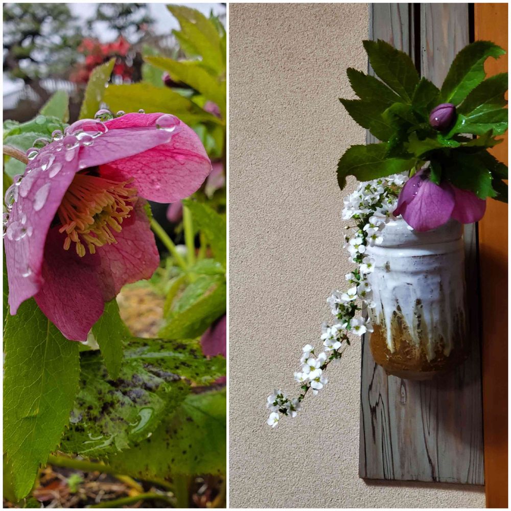 雨で倒れたそうな八ツ手花笠(クリスマスローズ)と雪柳