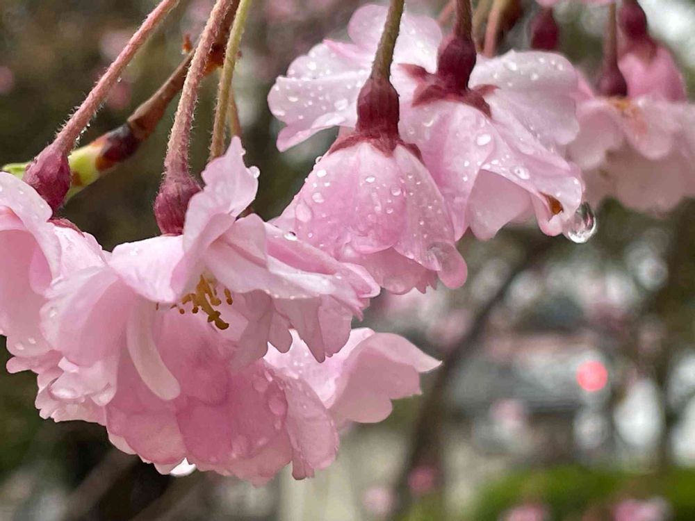 昨日、雨の中で瑞々しい姿を見せてくれていた、枝垂れ桜🌸