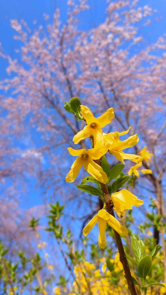 きれいな青空と桜を背景に、下から「ばあ‼︎」ってレンギョウさんが出てきたみたいですね😊