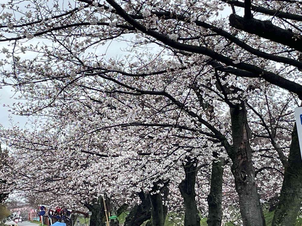 川沿いにたくさんの桜の木が並んでいて、7分咲きくらいかな?