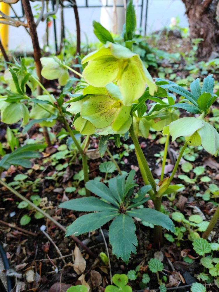 黄色のクリスマスローズ🌼🌱の下にはユキノシタやオキザリスの葉が姿を現しました🎵🌱