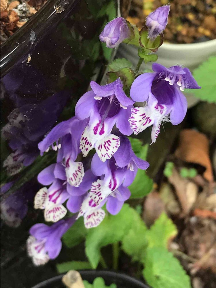 この花はたくさんランナーを出してすぐに鉢の外で活着します。実は写真の花も鉢の外の活着組です。あまり増えると雑草のようになるので適宜抜いていますが、花はご覧のようにいかにもシソ科です。花弁に毛が生えているのもシソ科らしいです😊。