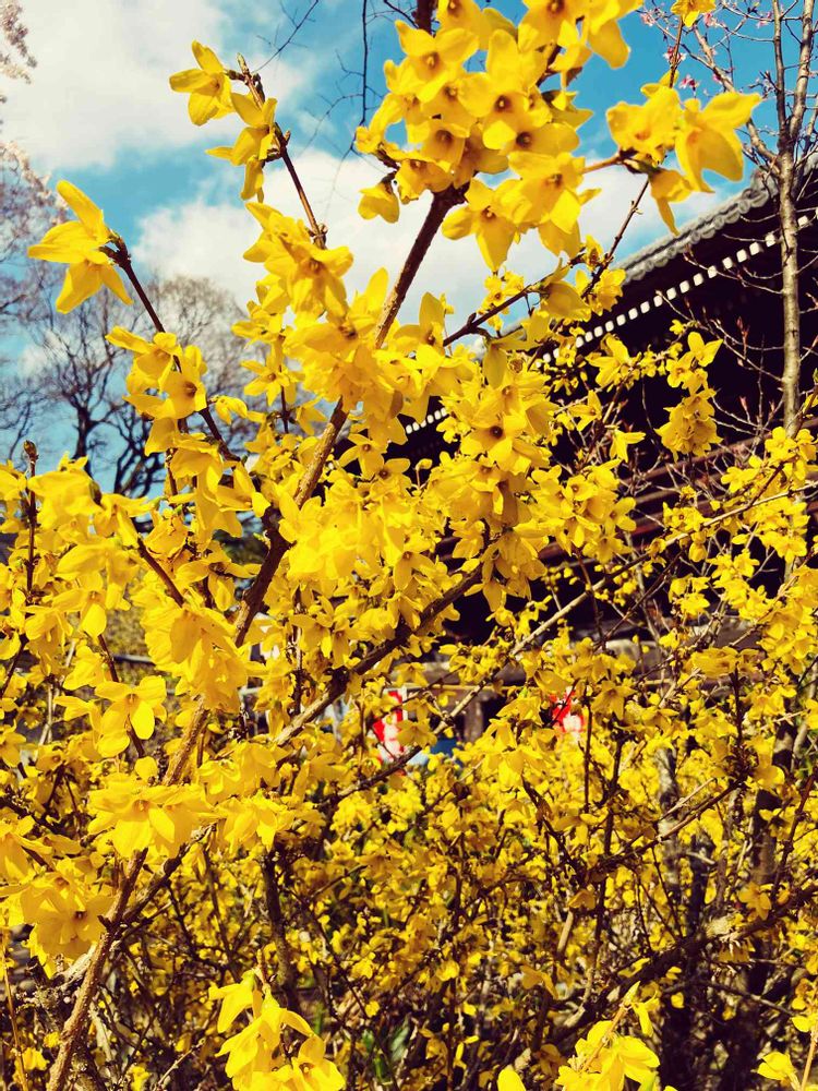 青い空に白い雲、そしてなんと鮮やかなレンギョウさん💛💛💛