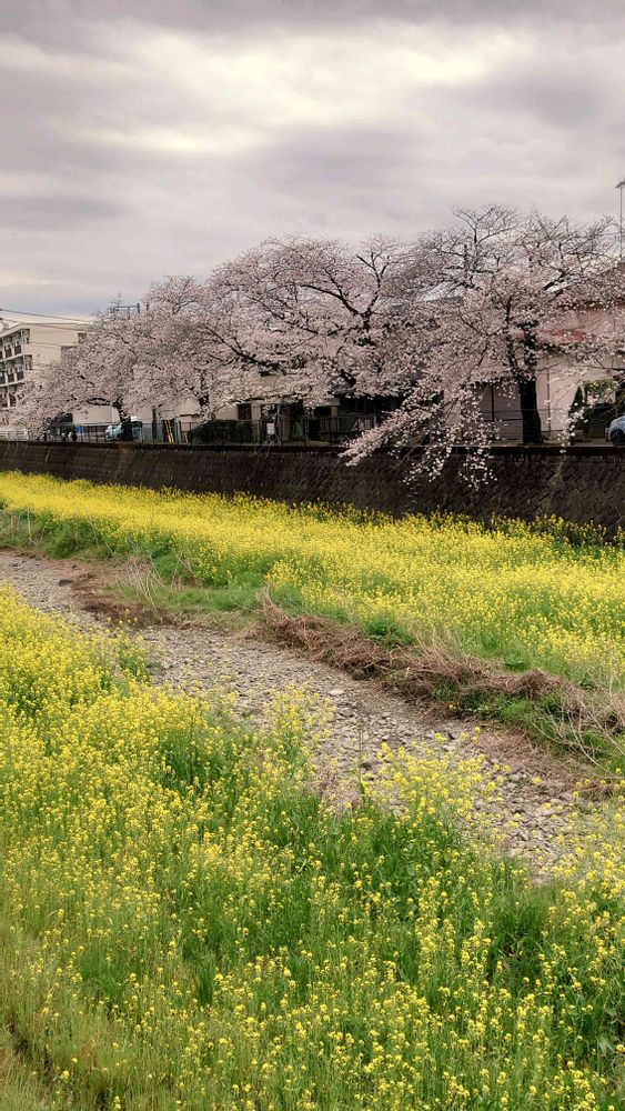近所の川です。両岸の菜の花と桜並木の共演です。桜はまだ八分咲きでしたが、雨が続きそうなので、早めに散歩してきました🌸🌸🌸