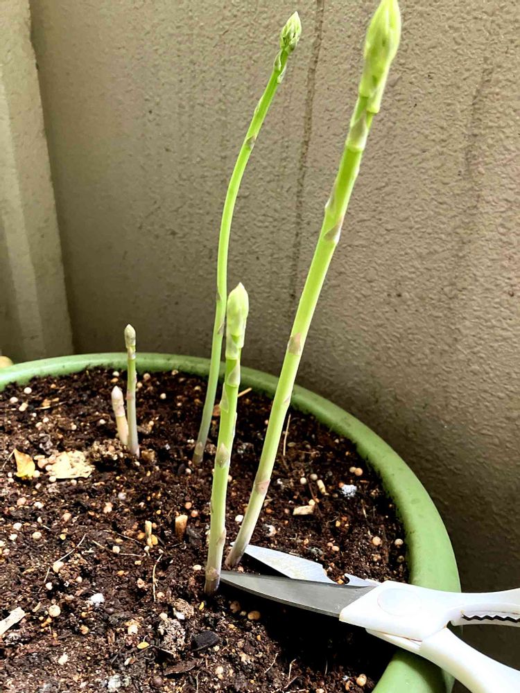 今年から、食べはじめましたが、今日までに5本取れました。買ってくるやつより細いですが、採りたてが食べられて、アスパラの匂いがとてもいい感じです😄