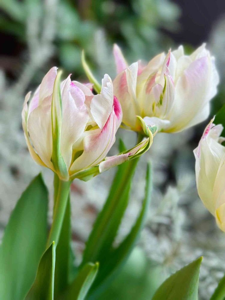 でもかなり開ききった状態て緑の萼のような花弁と白に少しピンク色が混ざった花びらがとても可愛いチューリップ🌷