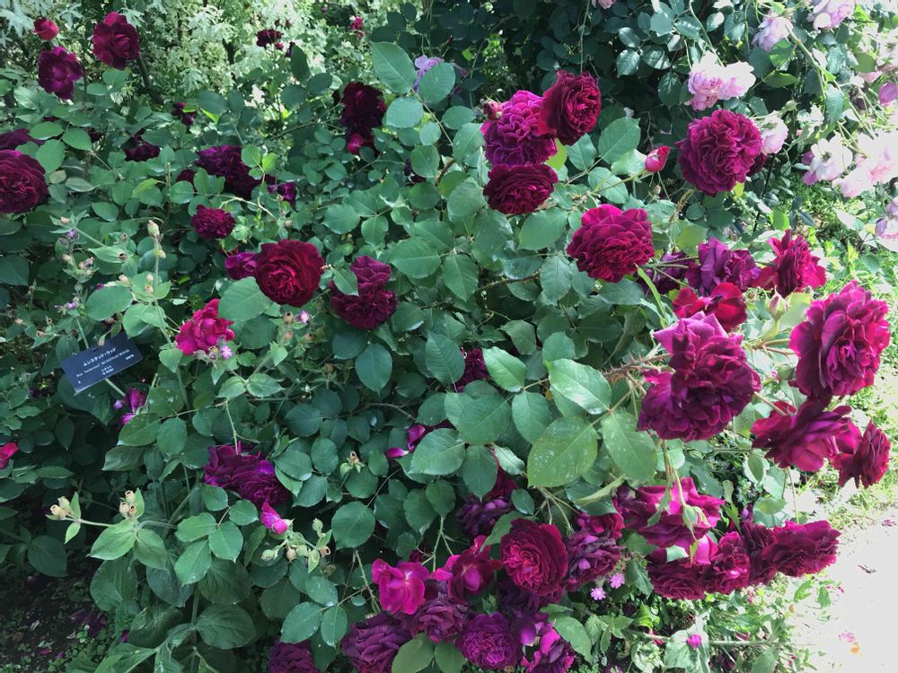 デビッド・オースチン氏が最初に制作した赤系の四季咲きバラ「ザ・ナイト」の子孫にあたるこのバラは、ザ・ナイトに近い濃い紫色が印象的でした。