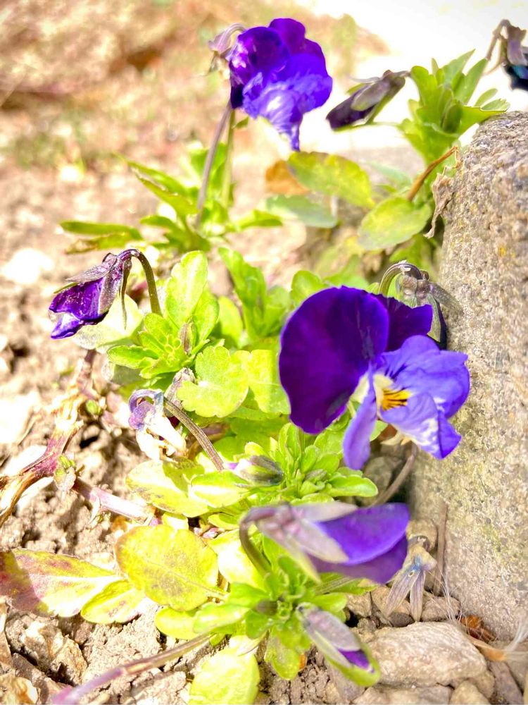 以前投稿していた、ど根性パンジー🏵残念ながら…力尽きました🥺でも…花壇のすみっこに冬越ししたパンジーを発見❗️💟ブロック🧱に寄りかかって暖かいのかな💗