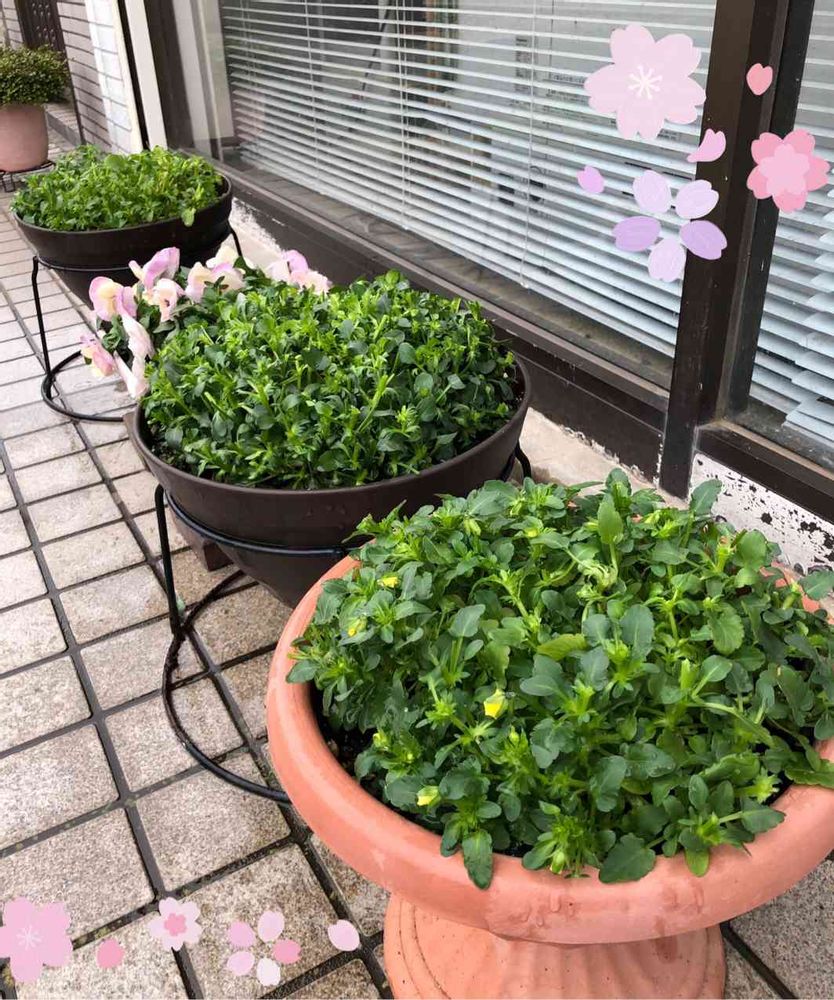 ピンク色のパンジーさんだけ残し店前のビオラさんを切り戻ししました〜