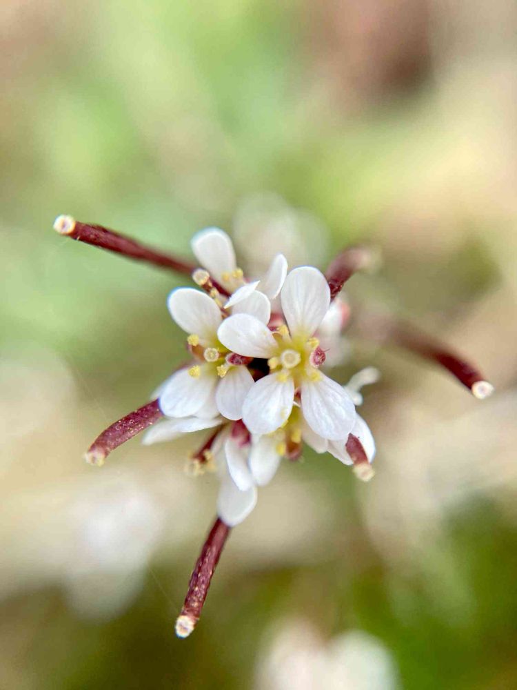 今朝の散歩で、よそ様の生け垣の隙間に可愛い花が咲いていたので写真を撮って今調べたらタネツケバナ属と出ました😱