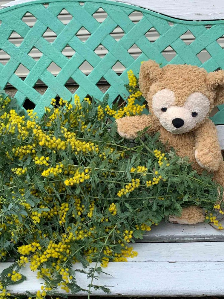 庭のミモザさんの2回目切り取り💛あともう2回くらい✂️💛毎年、花が咲いた後に4回くらいに分けて💛今日はダッフィーがお手伝い💛