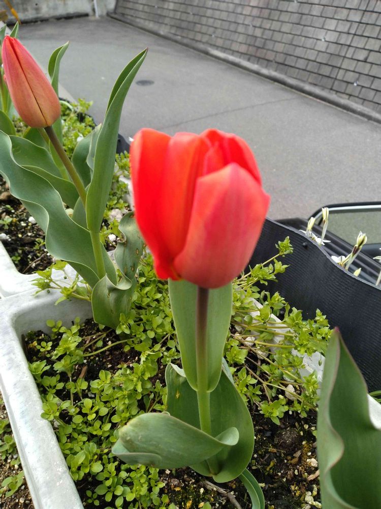 うちも赤いチューリップ*.🌷.*咲きましたが今日の雨で頭がうな垂れています😢