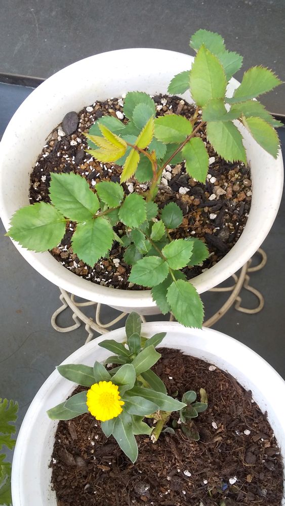 ⬆うどんこ病になっていたミニバラ、消毒しても次から次へと白い🌿が〜思い切って短く短ーく殆ど茎だけになるくらいカット✂️したら、日がたって今頃、綺麗な葉っぱが沢山出てきました