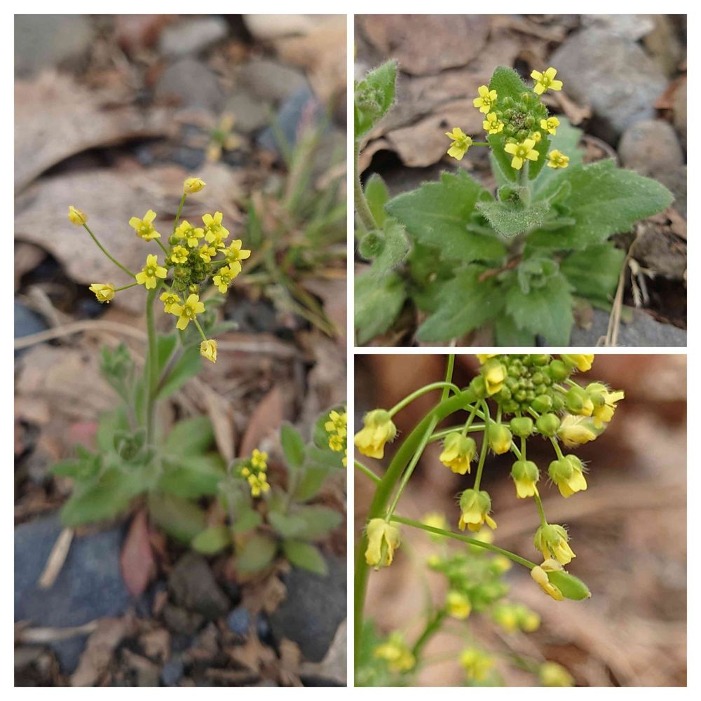 花は直径約4mmの黄色の十字形花で、雄しべは6個。