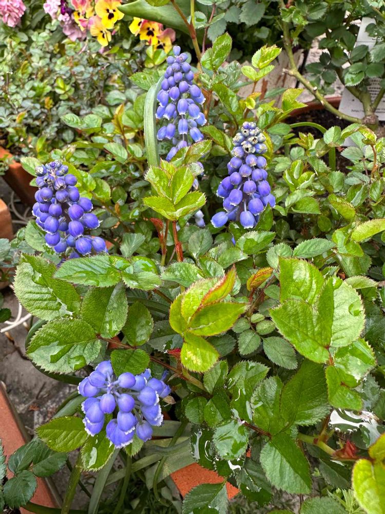 ミニバラと同居のムスカリはバラより背が高くなりました。