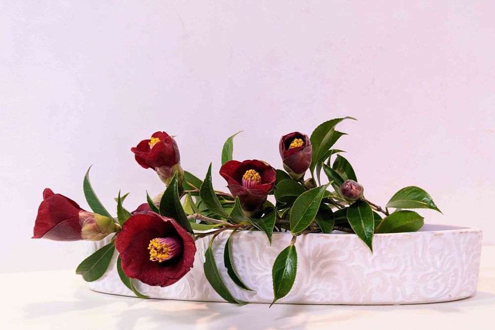 和の雰囲気漂う黒侘助を白くて平たい花器に生けてみたら黒侘助が際立ちました✨✨