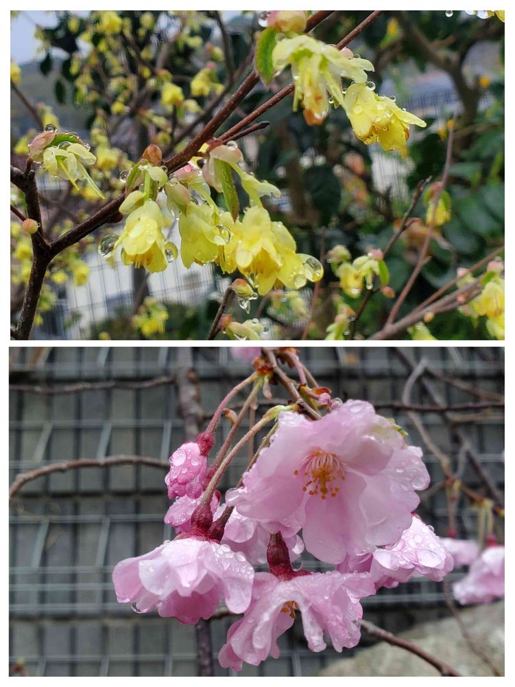 雨の雫をつけた枝垂れ🌸黄色のヒュウガミズキが美しいですね🥰