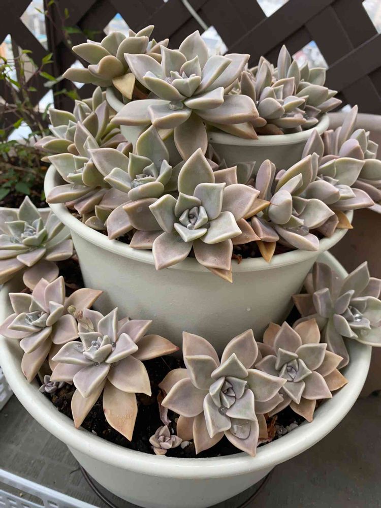 この朧月さんたちはメルカリにて知り合った多肉先輩からカット苗をたくさんいただいたものを三段鉢にうえつけただけなので、