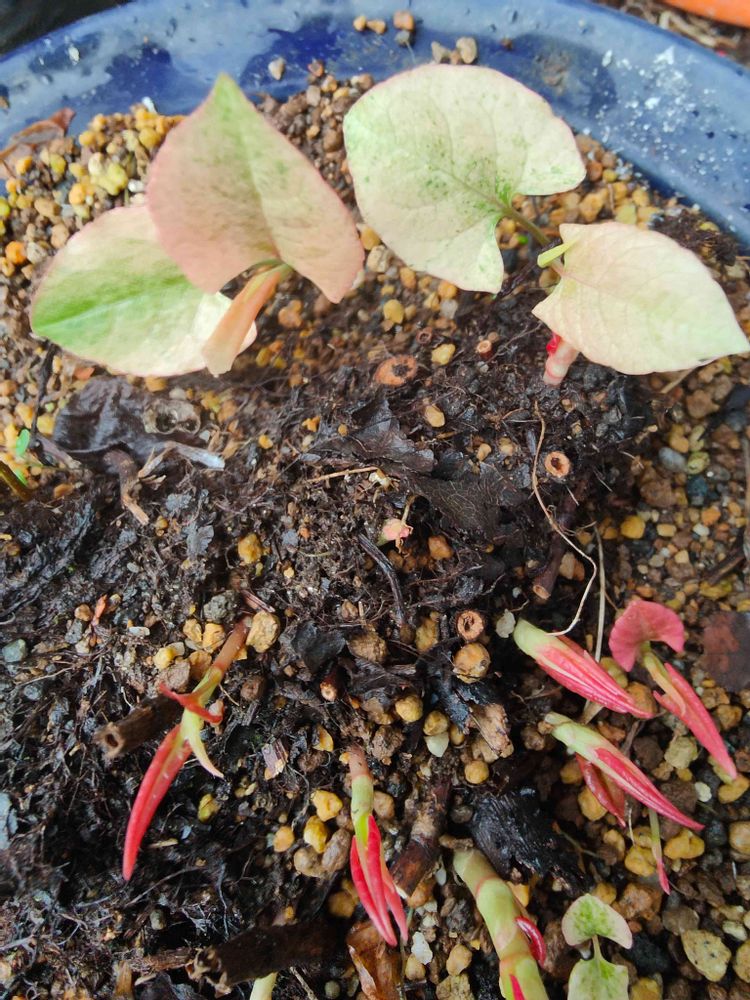 今年の斑入りイタドリはこんな色から始まった〜すかんぽ等といわれる山菜子供のお八つでしたねこのイタドリ線路の中に生えていた(時効)除草剤の影響かと疑いながら持ち帰り松の苗木と共に灌水する事30年にもなる強者園芸品種の赤い斑入りのものを横目に見ながら生き延びて来た株分けもしたいが又増えてしまう恐怖と戦ってる