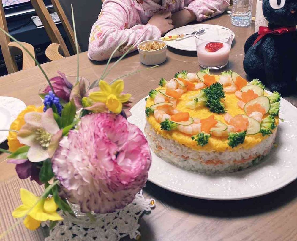 ㊗️お誕生日おめでとうございます🎶❣️ケーキ寿司美味しそう😍一緒に作る体験もできていいですね🤭私も孫がきたら楽しんでみたいと思いました😀ブロッコリーの飾り付け素敵です🥳