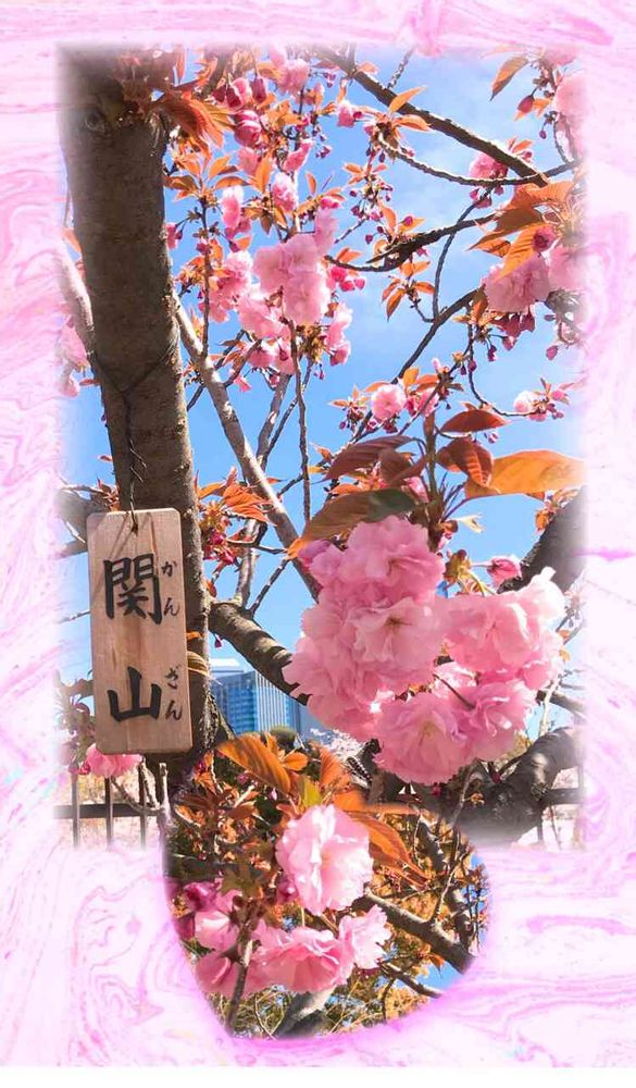 関山というのね。青空に映えて素敵なpicね。背景も素敵なコラージュ✨✨