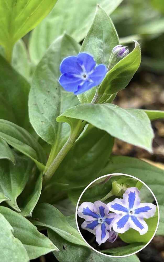 オンファロデス・カッパドキカ・スターリーアイズの親(右下)が咲いていた近くにいるコが咲きました。こぼれ種から咲いたお花はやはり単色ですね( ˆ꒳ˆ; )