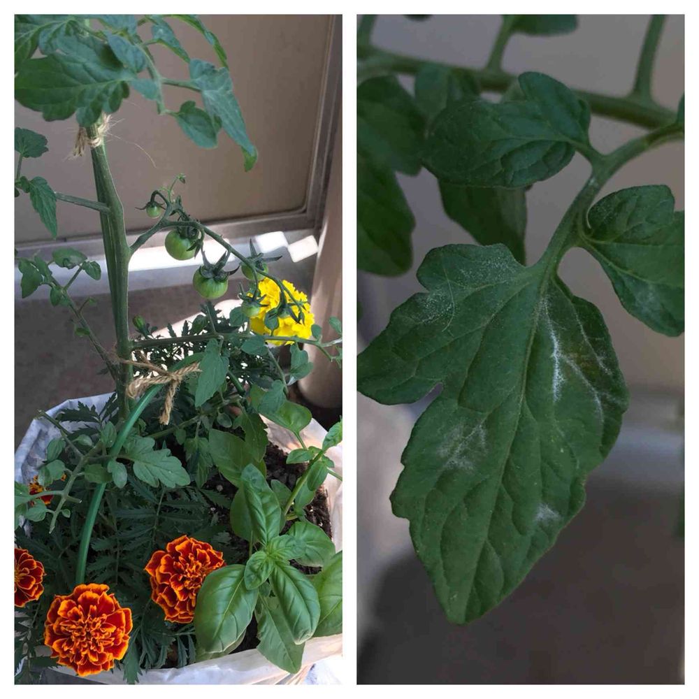 袋栽培のミニトマト 葉っぱの様子が変です。この白いものは 病気でしょうか?実はなっていっているのですが 心配です。