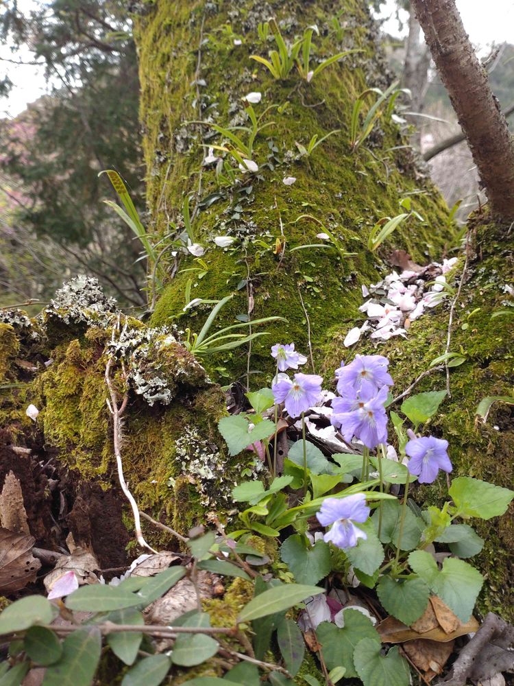 桜の巨木の地上1メートル位ところの朽ちた枝にスミレが咲いています。✨