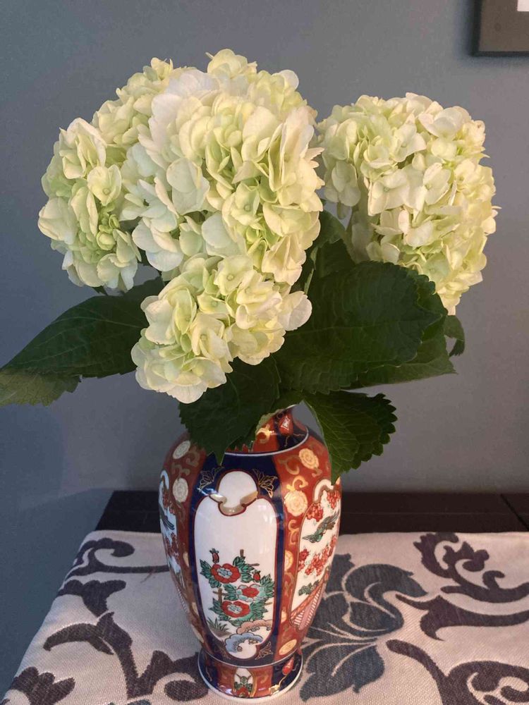 いただいた紫陽花は、結局いつもの花瓶でいつもの場所で。白い花がお気に入りです。
