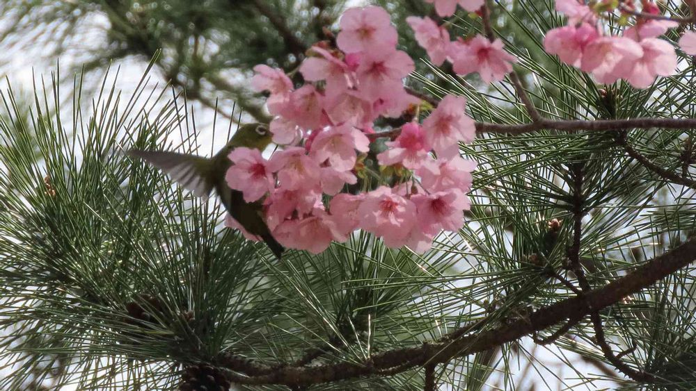 松をバックに桜🌸とメジロが可愛く見えました❣️