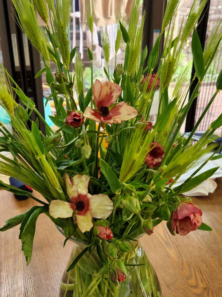 ラナンキュラスラックス・テセウスさん、畑のを切り花に、麦と一緒に飾ってみました。