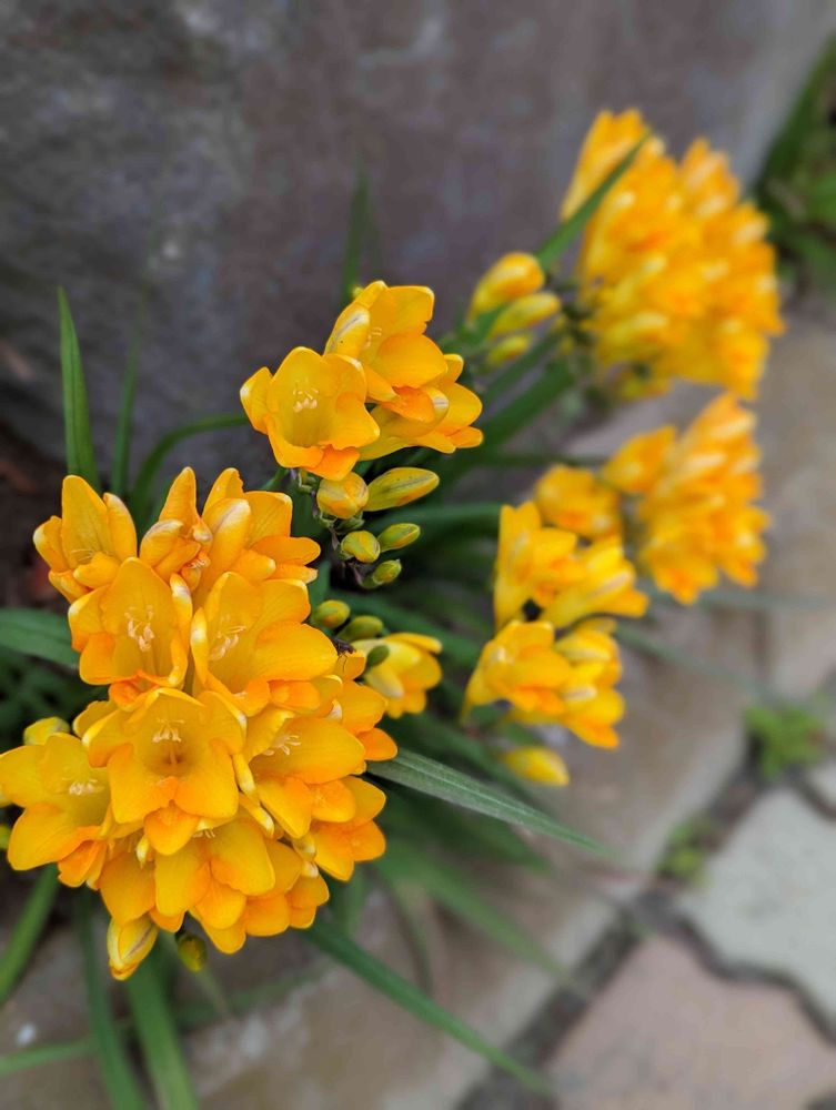 岩と歩道の隙間から毎年元気に咲いてくるフリージア💛🧡