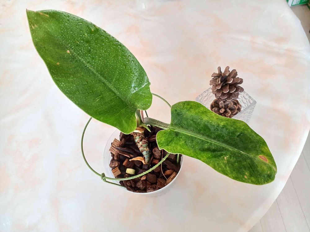 フィロデンドロン 植え替えました。植え替え前の葉は全部枯れて新しいはが一気に大きくなりました。這っていた茎を上向きにしたくてワイヤーの支えで起こしました。このまま上に伸びて欲しいところですが😊