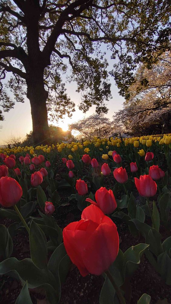大きな樹と桜を背景にたくさんのかわいいチューリップさんたち🌷💕🌷💕🌷