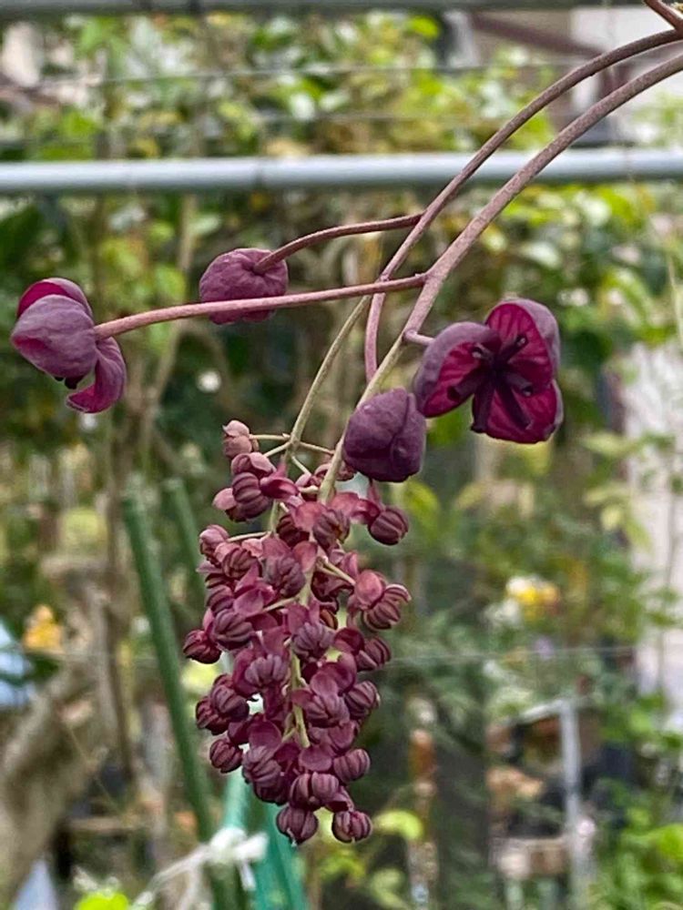 上の大きい花が雌花で、下の小さな雄花を従えているかのようです。