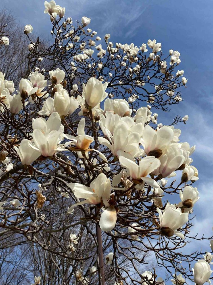 上空を見上げる位の高い木にハクモクレンの花が咲いてとても綺麗でした。