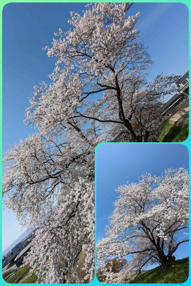 青空とコラボしてモリモリと咲き誇る満開の🌸幾坂池の一本桜🌸