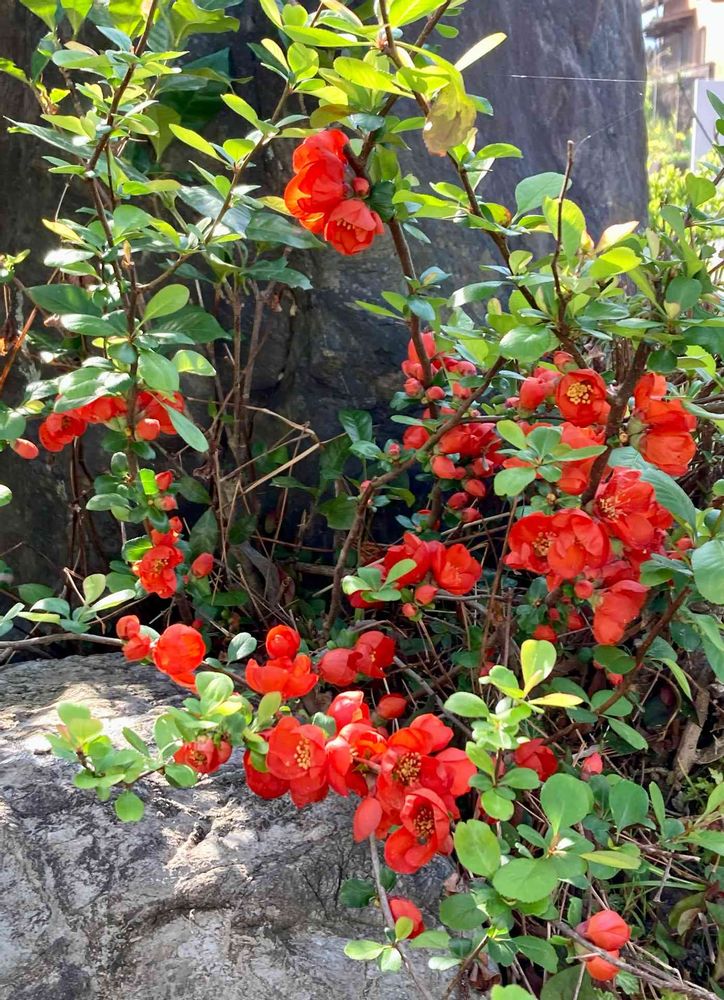 ボケ(木瓜)の花 織田信長の家紋なんですね。お日様の光を浴びて力強く咲いてます❣️