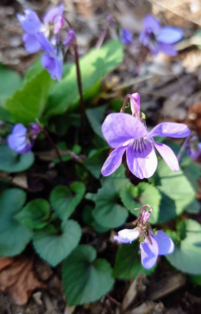 薄紫色のタチツボスミレの花が木漏れ日に輝いています💜🌿