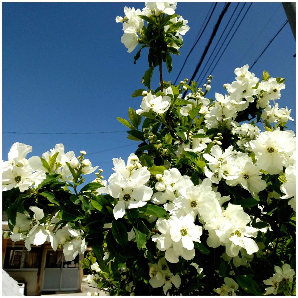 真っ青な空と利休梅、何故か毎年車を停めて眺める木です😍